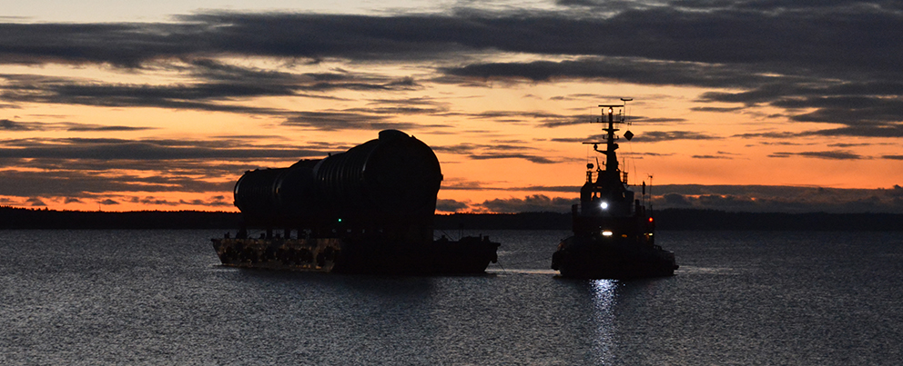 I januari 2018 fraktade vi tre indunstare från Göteborg till Gruvöns bruk i Värmland. Indunstarna med en totalvikt på 389 ton byggdes i Spanien och och fraktades till Göteborg med båt där de sedan lastades om till vår pråm Kanalia och bogserbåten Bjönn för vidare transport norrut över Vänern.